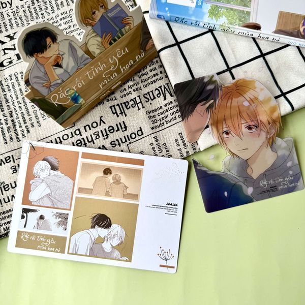 Không chỉ đem lại một câu chuyện đáng yêu của cặp đôi đồng niên, Rắc rối tình yêu mùa hoa nở còn đi kèm với một set phụ kiện xinh iu: standee giấy, PVC card và postcard. Truyện đã có sẵn trong gian hàng của Amak, truy cập ngay tại đây để rinh ngay về nha!