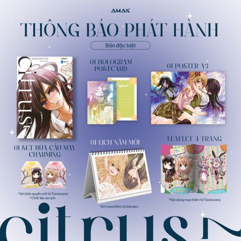 - Bản đặc biệt: 01 Hologram Postcard hai mặt, 01 Leaflet 4 trang (với hình ảnh & nội dung mua thêm từ chuỗi cửa hàng Toranoana), 01 bộ lịch năm mới để bàn - trang bìa sử dụng art bản quyền mới từ Gamers, set cầu may acrylic CHARMING (tranh mới không có trong sách gốc) và 01 poster A3. Giá bìa: 238.000vnd