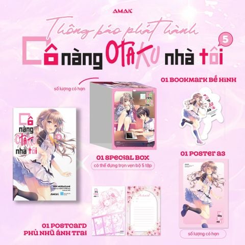 - Quà tặng kèm: 01 bookmark bế hình nhân vật, 01 postcard phủ nhũ ánh trai, 01 poster A3 (số lượng có hạn), 01 Special Box kỷ niệm trưng bày được trọn bộ 5 tập truyện (số lượng có hạn). Giá bìa: 118.000vnd