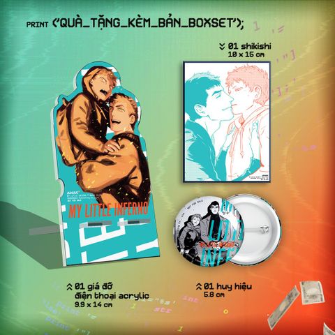 - Bản boxset: - 350.000VNĐ: Box nắp gập nam châm, 02 Sách (Tập 1 & 2) - 02 Bìa sách đặc biệt tặng kèm - 02 Bookmark (1 tập/cái) (5x15cm) - 02 Postcard (1 tập/cái) (10x15cm) - 01 Giá đỡ điện thoại acrylic (9.9x14cm) - 01 Huy hiệu (5.8cm) - 01 tranh bồi bìa cứng (10x15cm)
