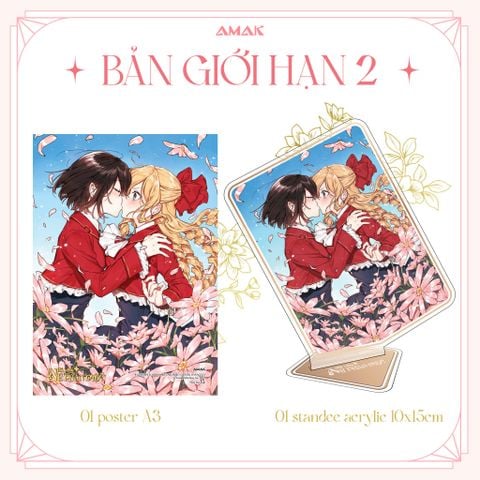 - Bản giới hạn version 2: 01 bookmark hai mặt, bộ 10 postcard, 01 lót ly giấy (~10cm), tặng thêm 01 bìa áo hình gốc bản Nhật, 1 standee Acrylic theo hình bìa gốc bản Nhật (10x15cm) ,1 poster A3 (cùng hình standee) Giá bìa: 319.000đ